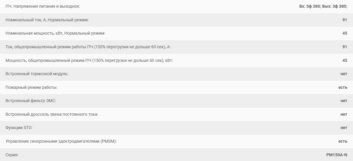 | Насосно-вентиляторный режим работы ПЧ, А: | 91 | ||
